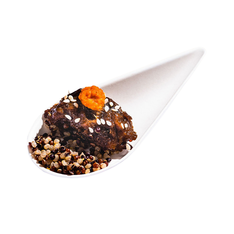 Enjoy the rich flavors of our BBQ Pulled Shiitake with Quinoa, a plant-based amuse-bouche featuring smoky BBQ pulled shiitake mushrooms, quinoa, and a rich red pepper dip, topped with sesame seeds. Ideal for 16 portions, this vegan treat offers a delightful and hearty bite.