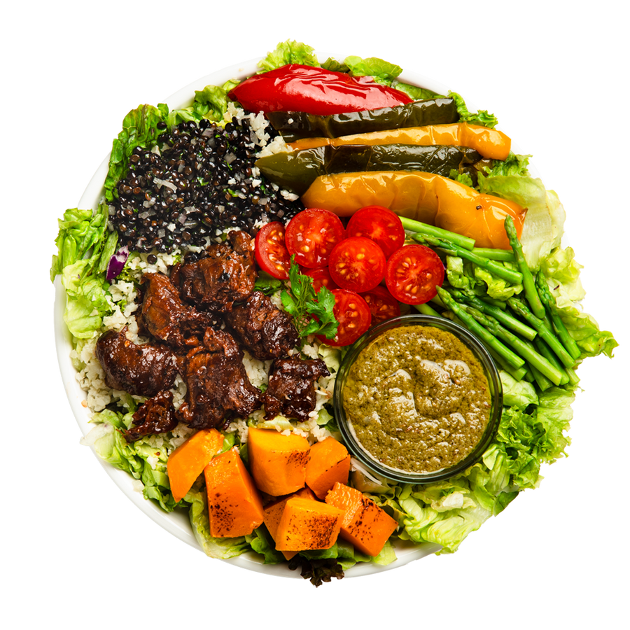 Game Changer Transform your meal with Game Changer’s BBQ pulled shiitake, cauliflower lentil rice, mixed greens, spiced lentils, roasted capsicum, roasted pumpkin, cherry tomatoes, Thai asparagus, mixed seeds, fresh herbs, and Green Harissa Vinaigrette dressing. A vegan powerhouse.