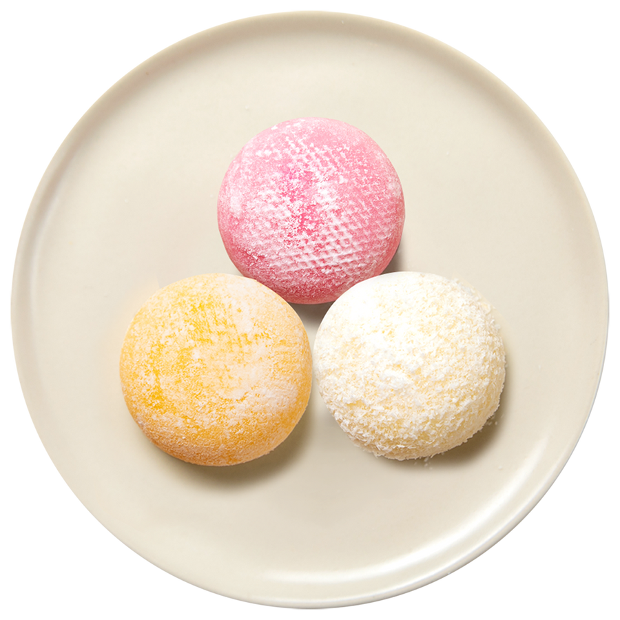 A delightful selection of soft, chewy mochis featuring there different flavours, chocolate, strawberry and coconut