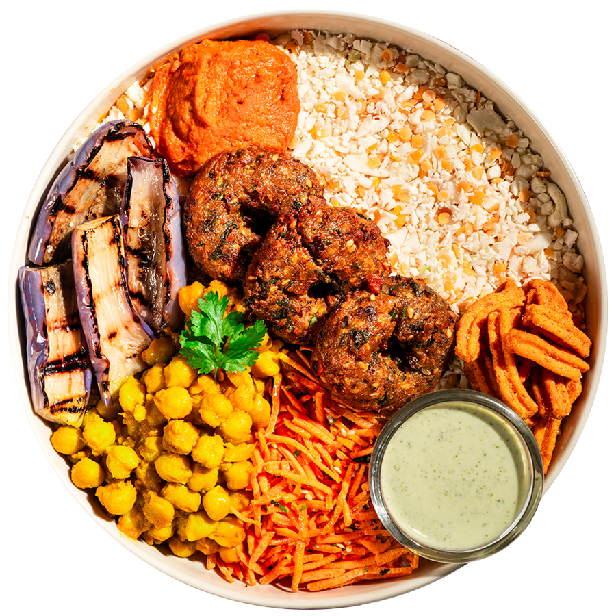 Spice Trade Indulge in the rich flavors of Spice Trade with falafels, cauliflower lentil rice, fried eggplant, spiced chickpeas, carrot salad, soya crisps, and Red Pepper Dip & Tzatziki.