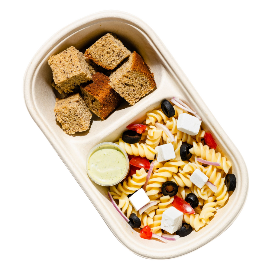 Fusilli Salad with Banana Cake Bento Savor our Fusilli Salad with Banana Cake Bento, featuring fusilli, feta, black olives, cherry tomatoes, red onions, Basil Pesto, and a slice of Banana Cake with Acai Superfruit.