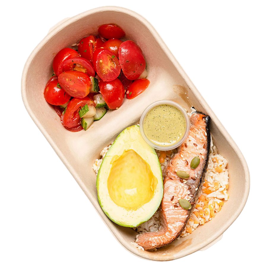 Keto Diet Bento Embrace low-carb living with our Keto Diet Bento, offering cauliflower lentil rice, sous-vide salmon, avocado, tomato salad, and mixed seeds, topped with Green Goddess dressing.