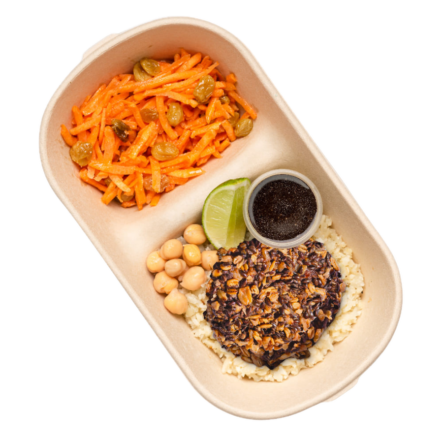 Low Footprint Bento Make a sustainable choice with our Low Footprint Bento, featuring cauliflower lentil rice, falafels, chickpeas, carrot salad, and a lime wedge, paired with Yuzu Soy.
