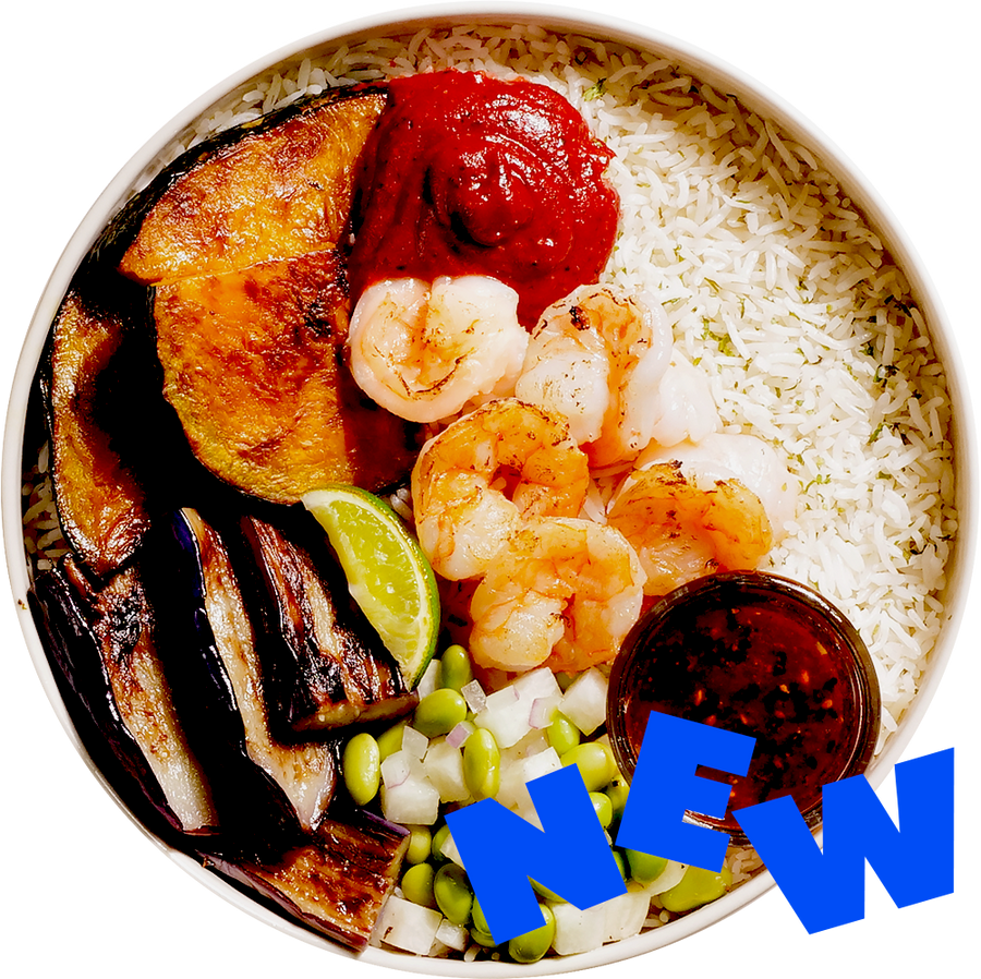 Let the flavors of the earth and sea nourish you with Pacha Mama, a vibrant healthy warm bowl packed with bold, wholesome ingredients. Enjoy succulent baked prawns, herb-infused rice, roasted pumpkin wedges, crispy fried eggplant, and zesty turnip salad. Finished with a lime wedge, sweet chili dip, and Hot Honey Vinaigrette — this dish is a delicious, energizing celebration of flavor and nutrition.